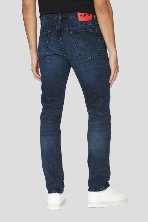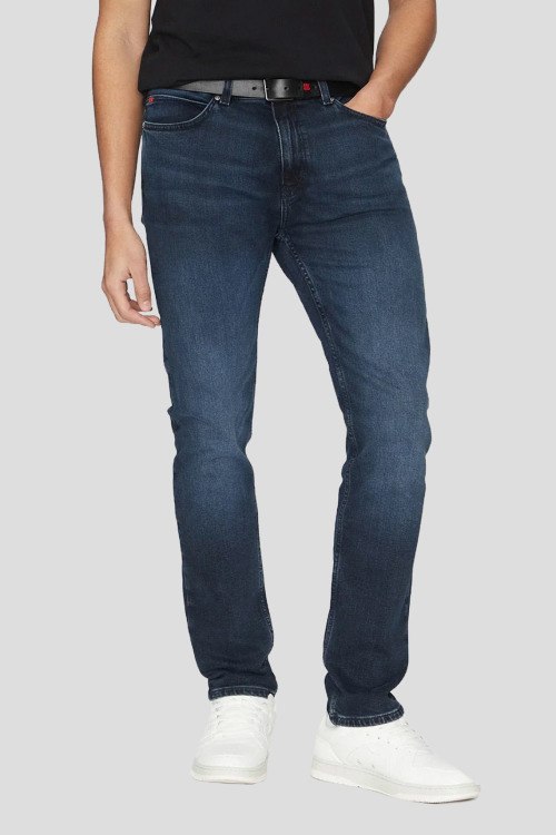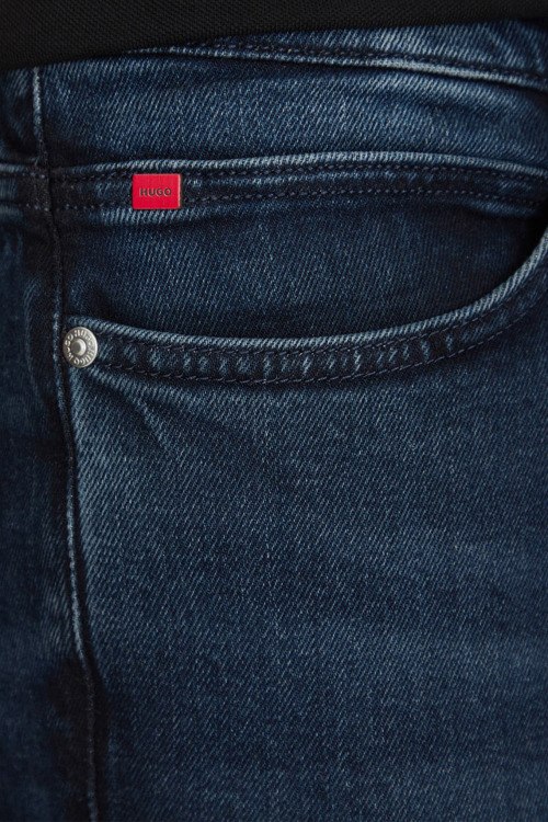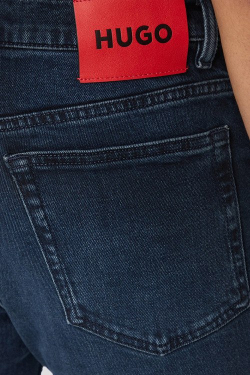 Детали: Мужские темно-синие зауженные джинсы Hugo 708 от Hugo Boss (Хуго Босс). Пяти-карманная модель, пояс с петлями для ремня, нашивка с логотипом сзади на поясе, полная длина, крой Slim Fit