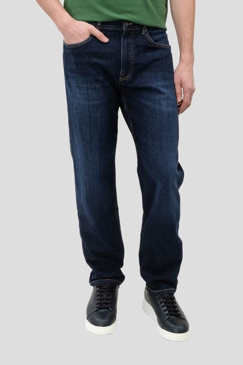 Детали: Мужские темно-синие джинсы Relaxed Fit из хлопкового микса от Hugo Boss (Хуго Босс). Классическая длина, средняя посадка, застежка на молнию и пуговицу, пять карманов, петли в поясе для ремня, патч-лого