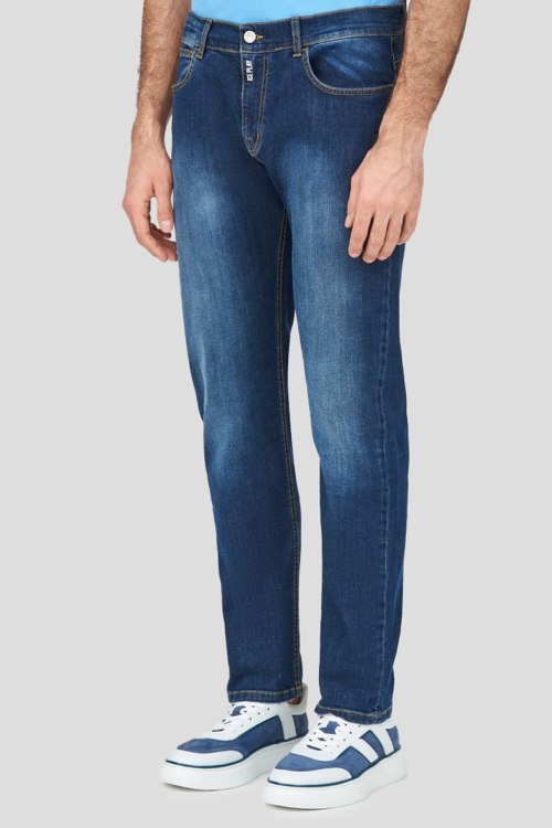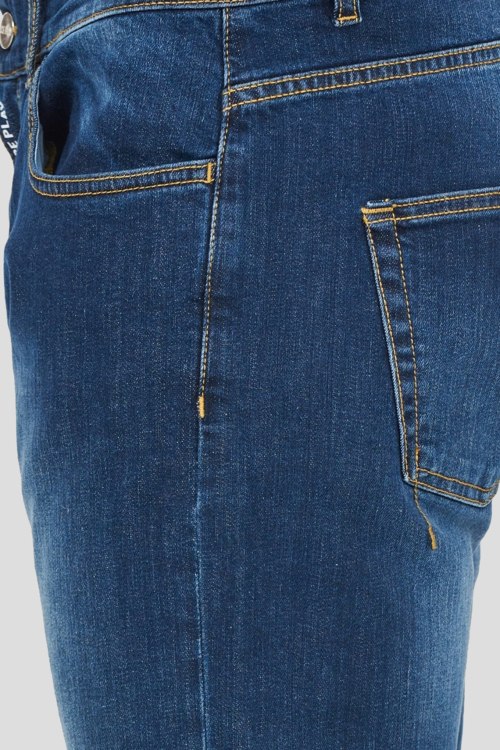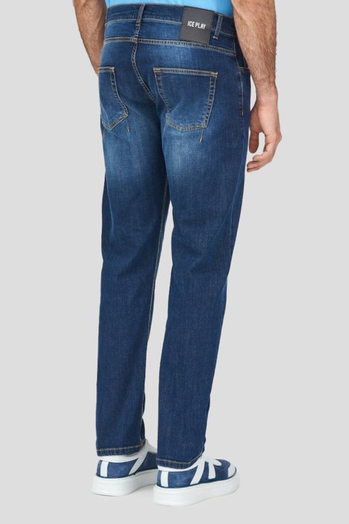 Детали: Мужские темно-синие джинсы от Ice Play (Айс Плей). Пяти-карманная модель, дизайн с потертостями, пояс с петлями для ремня, нашивка с логотипом сзади на поясе, прямой крой, полная длина