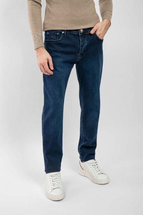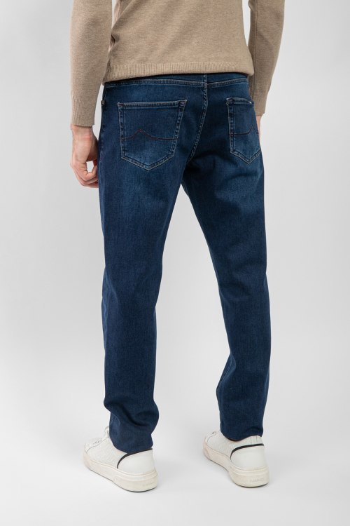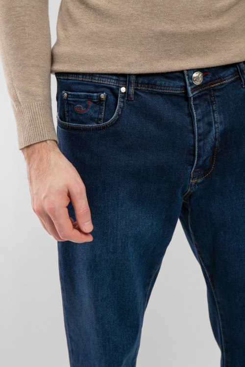 Мужские темно-синие джинсы из хлопкового микса от Jacob Cohen (Джейкоб Коэн). Классическая длина, застежка на пуговицы, пять карманов, вышитый логотип бренда, петли в поясе для ремня, патч-лого.