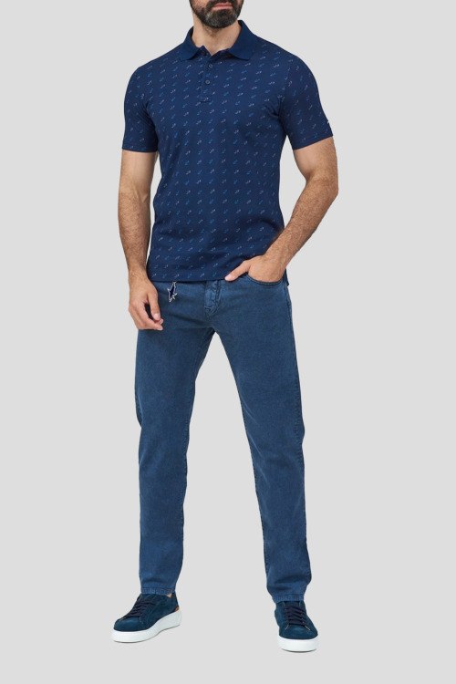 Детали: Мужские темно-синие джинсы из микса хлопка и полиэстера от Paul & Shark (Пол энд Шарк). Пяти-карманная, зауженная модель, застежка на пуговицу и молнию, петли для ремня на поясе, патч-лого, съемный брендированный брелок