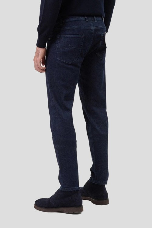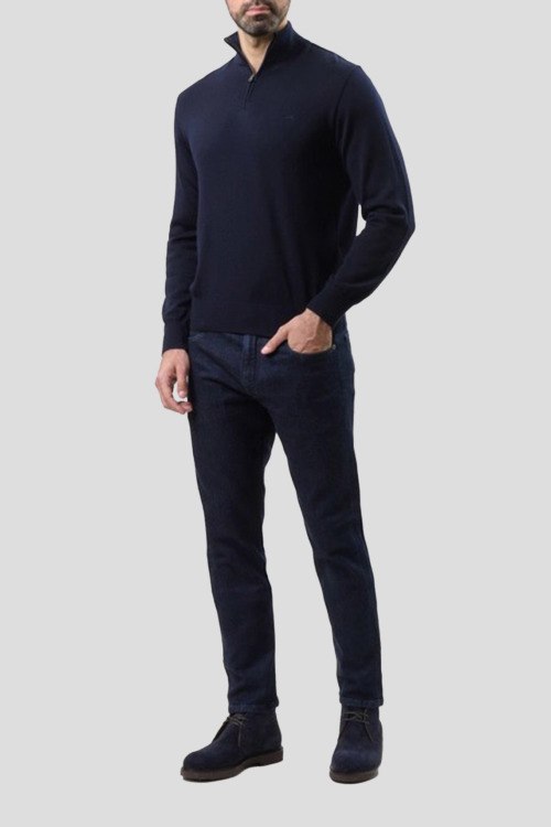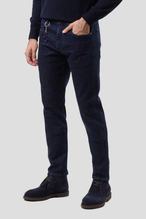 Детали: Мужские темно-синие джинсы с примесью кашемира от Paul & Shark (Пол энд Шарк). Пяти-карманная модель, пояс с петлями для ремня, нашивка с логотипом сзади на поясе, подвеска с брелком, зауженный крой, полная длина