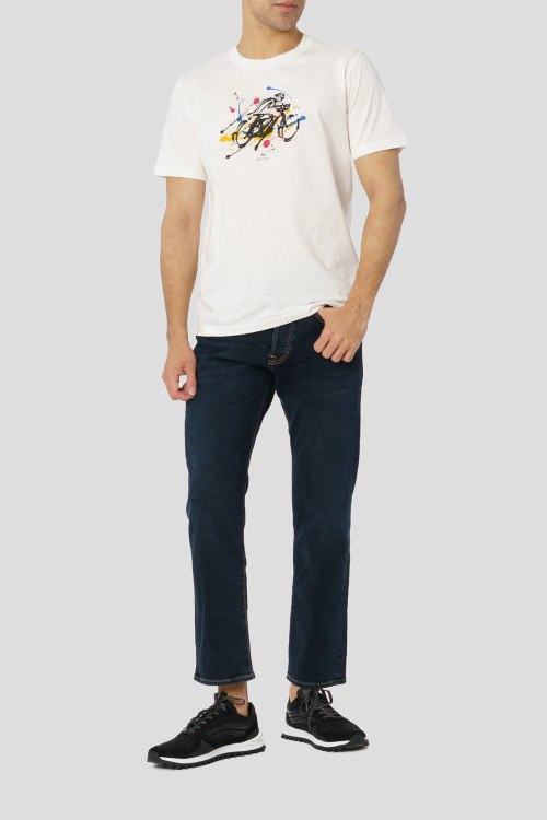 Мужские темно-синие прямые джинсы от Paul Smith (Пол Смит). Пяти-карманная модель, пояс с петлями для ремня, нашивка с логотипом на заднем кармане, укороченная длина