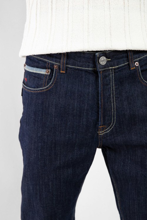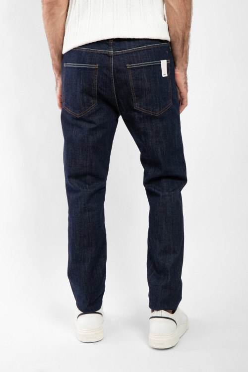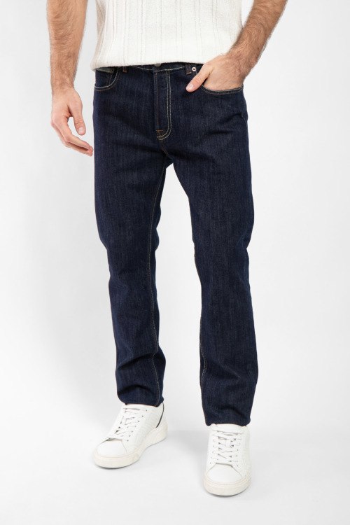 Мужские темно-синие прямые джинсы от PMDS (ПиЭмДиЭс). Пяти-карманная модель, пояс с петлями для ремня, нашивка с логотипом сзади на поясе, прямой крой, полная длина.