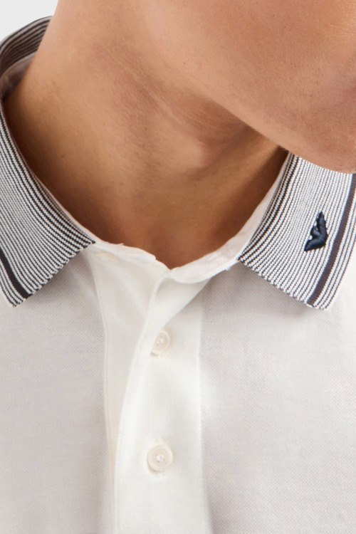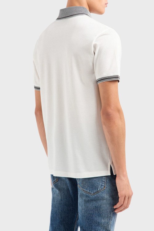 Детали: Мужская белая хлопковая футболка-поло от Emporio Armani (Эмпорио Армани). Отложной воротник с логотипом, застежка на три пуговицы, короткий рукав, классическая длина