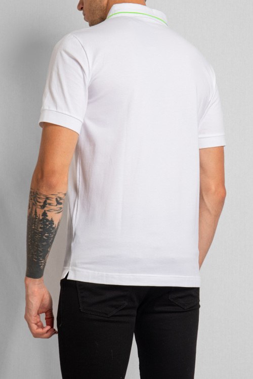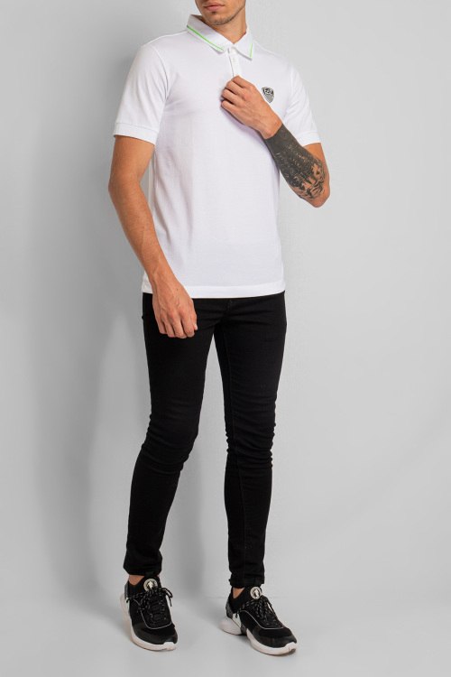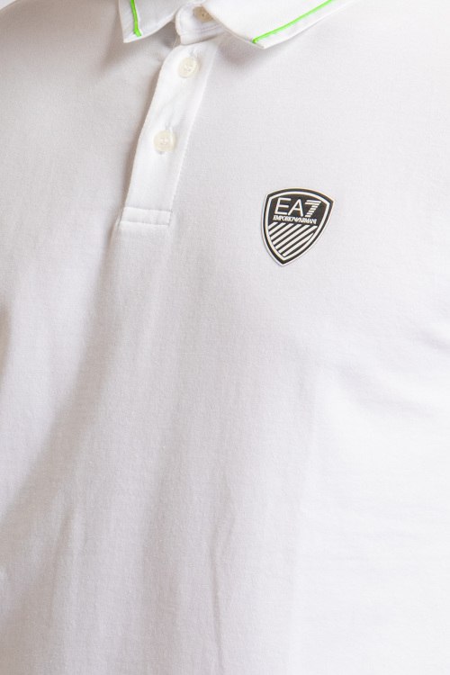 Мужская белая футболка-поло из хлопка от EA7 Emporio Armani (EA7 Эмпорио Армани). Отложной воротник с контрастным кантом, логотип бренда на груди, короткий рукав, застежка на пуговицы.