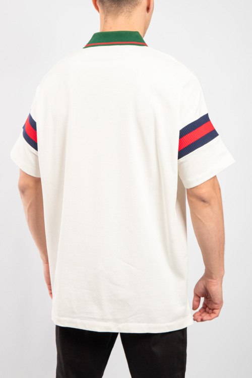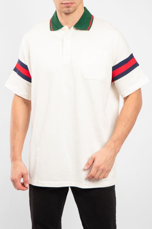 Мужская белая хлопковая футболка-поло Gucci Stripe от Gucci (Гуччи). Фасон oversize, фирменные полоски Web, карман на груди, отложной воротник, застежка на три пуговицы, короткий рукав, удлиненная длина.