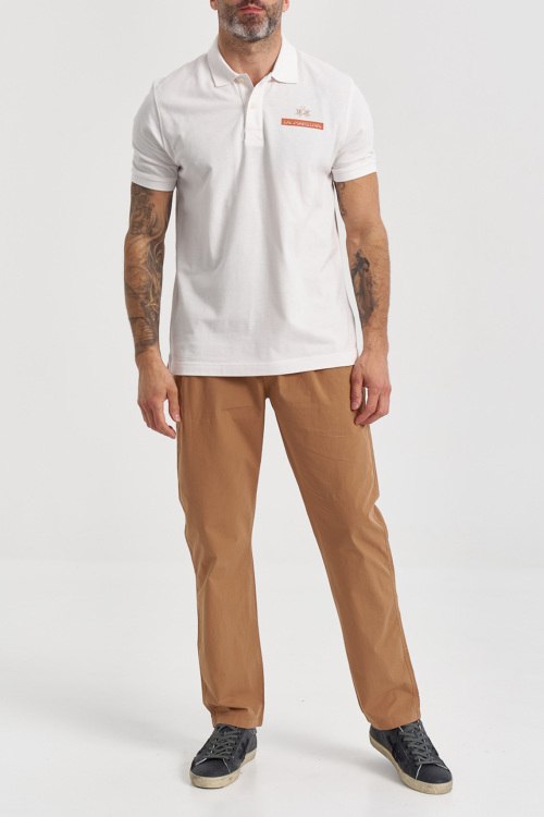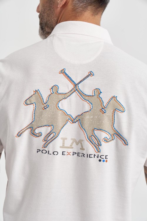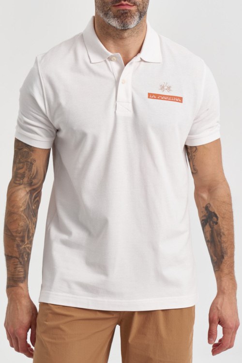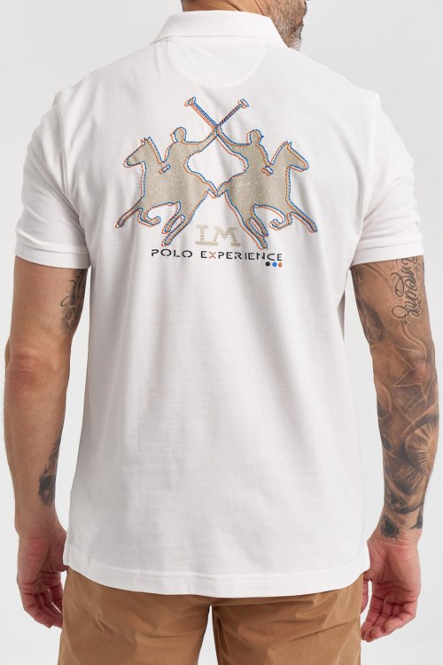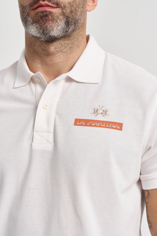 Детали: Мужская белая хлопковая футболка-поло от La Martina (Ла Мартина). Логотип на груди и на спине, отложной воротник, застежка на две пуговицы, короткий рукав, классическая длина. Параметры модели: 103 см - 87 см - 99 см. Рост - 182 см. Размер на фото - L