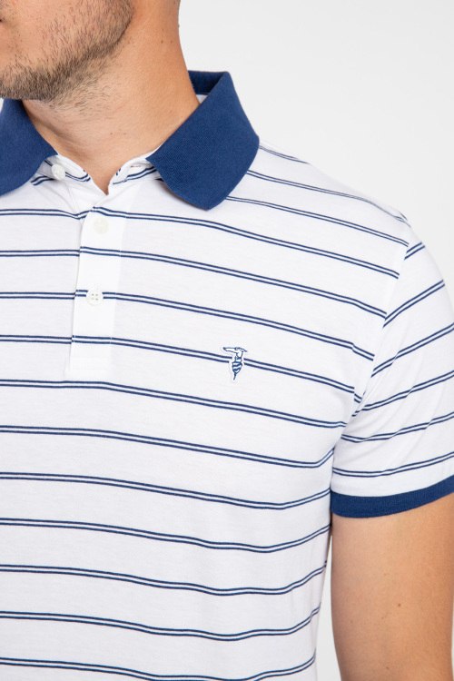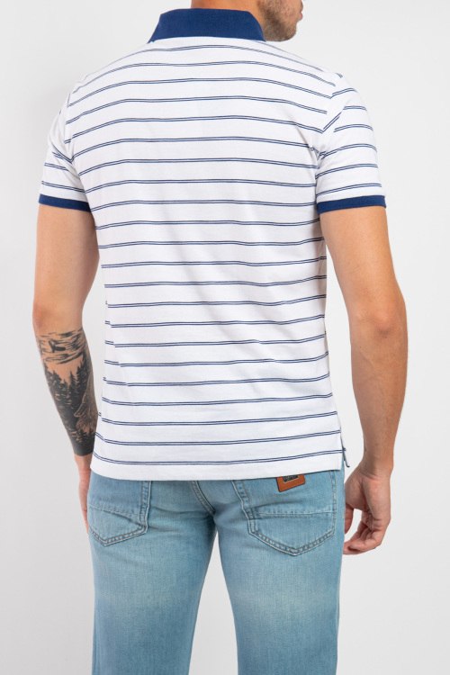 Мужская белая футболка-поло из хлопка от Trussardi (Труссарди). Классический отложной воротник, горловина застегивается на пуговицы, короткие рукава, горизонтальная полоска, логотип бренда на груди.