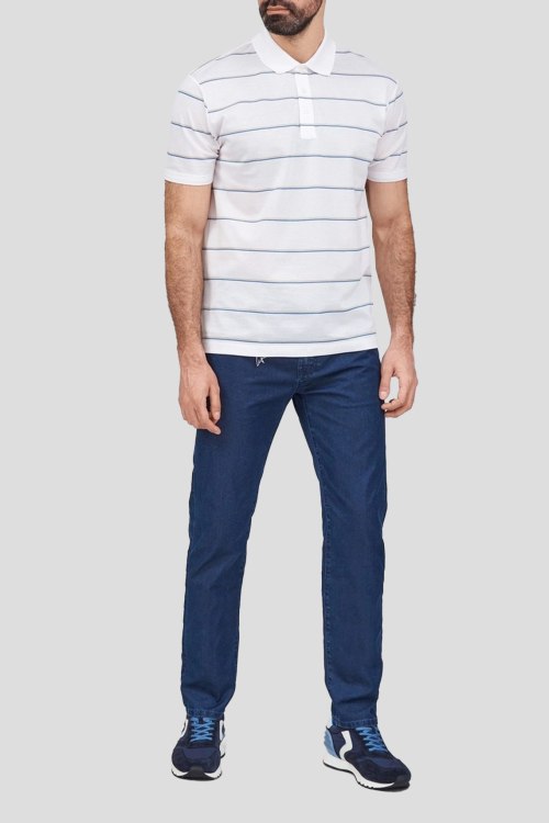 Детали: Мужская белая хлопковая футболка-поло от Paul & Shark (Пол энд Шарк). Отложной воротник, принт в полоску, застежка на три пуговицы, короткий рукав, классическая длина
