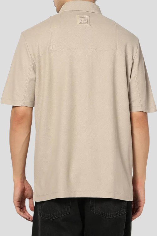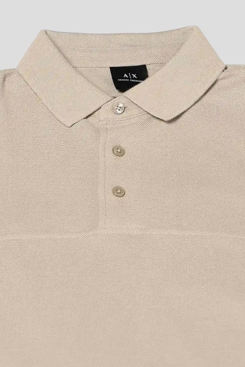 Детали: Мужская бежевая хлопковая футболка-поло от Armani Exchange (Армани Эксчендж). Отложной воротник, застежка на три пуговицы, короткий рукав, классическая длина