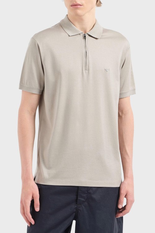 Детали: Мужская песочная футболка-поло из лиоцелла и хлопка от Emporio Armani (Эмпорио Армани). Логотип на груди, отложной воротник, застежка-молния, короткий рукав, классическая длина