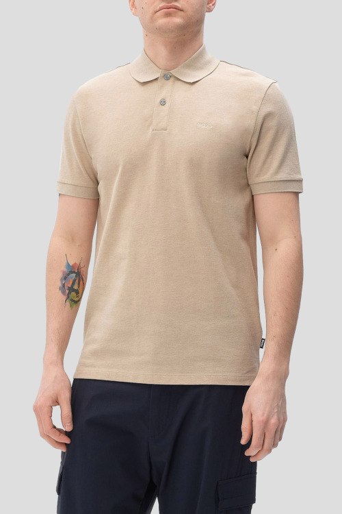 Детали: Мужская бежевая хлопковая футболка-поло Pallas от Hugo Boss (Хуго Босс). Логотип на груди, отложной воротник, застежка на две пуговицы, короткий рукав, классическая длина