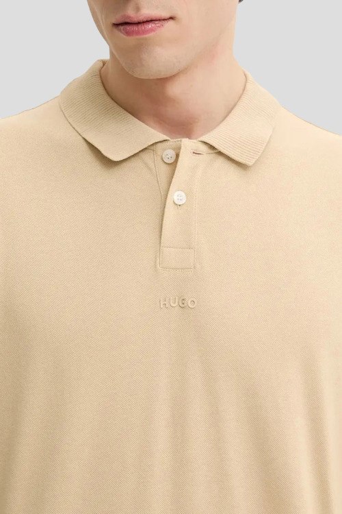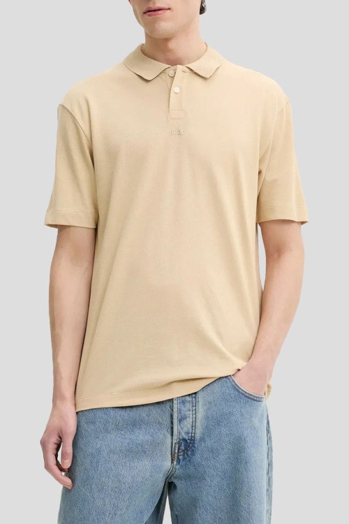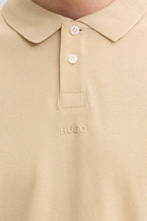 Детали: Мужская бежевая хлопковая футболка-поло от Hugo by Hugo Boss (Хуго бай Хуго Босс). Логотип на груди, отложной воротник, застежка на две пуговицы, короткий рукав, классическая длина