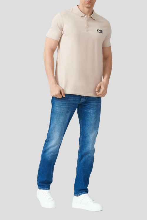 Детали: Мужская бежевая хлопковая футболка-поло от Karl Lagerfeld (Карл Лагерфельд). Логотип на груди, отложной воротник, застежка на три пуговицы, короткий рукав, классическая длина