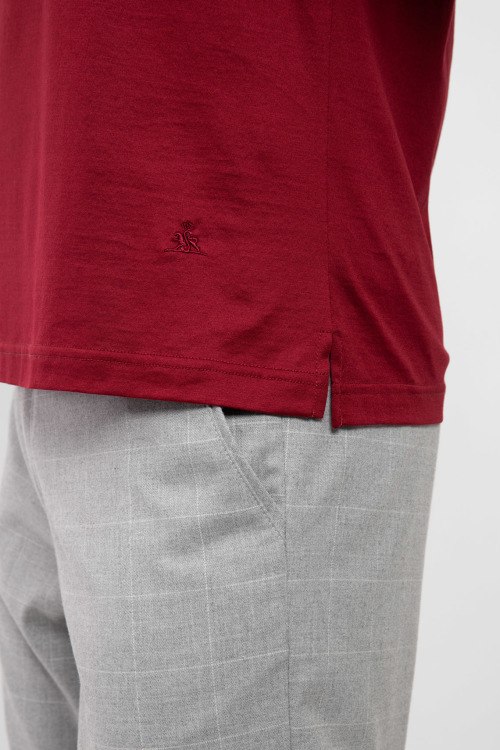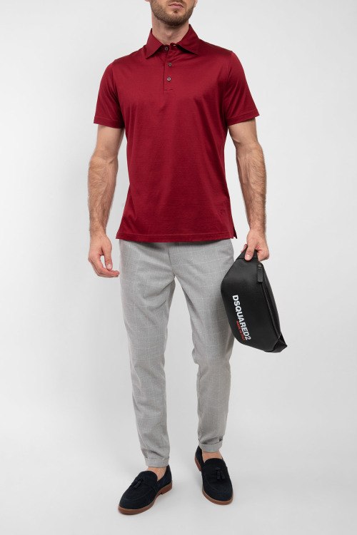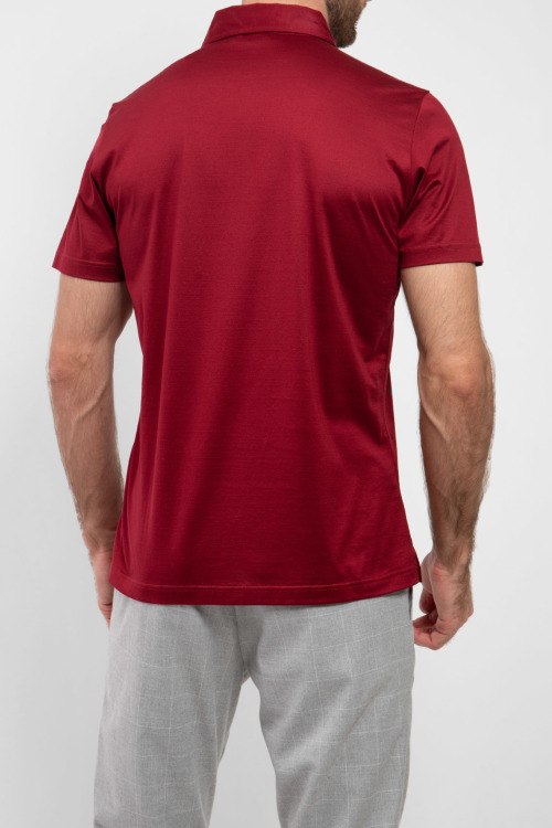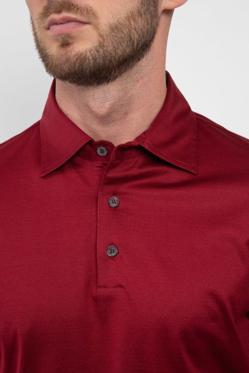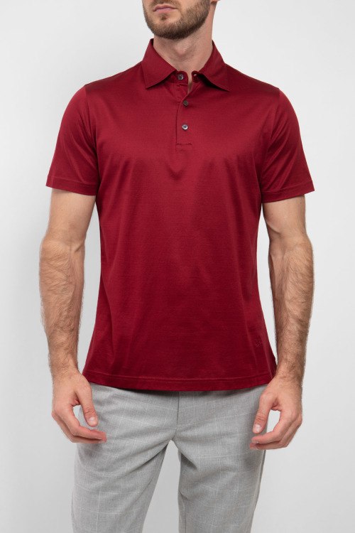Мужская бордовая футболка-поло из хлопка от Scabal (Скабал). Классический воротник, горловина застегивается на пуговицы, короткие рукава, вышитый логотип бренда, по бокам разрезы.
