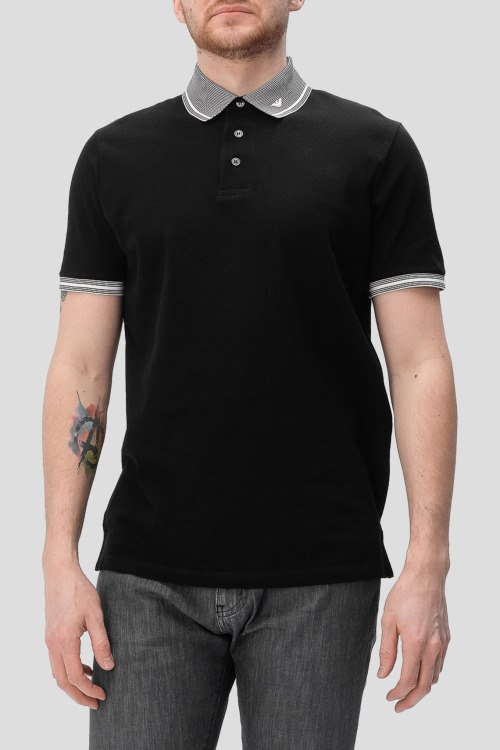Детали: Мужская черная футболка-поло из хлопка от Emporio Armani (Эмпорио Армани). Классический воротник, горловина на пуговицы, короткие рукава, контрастная окантовка