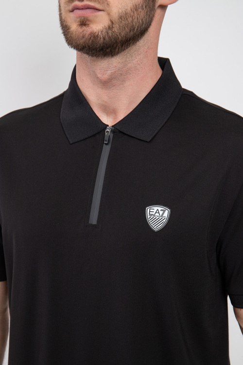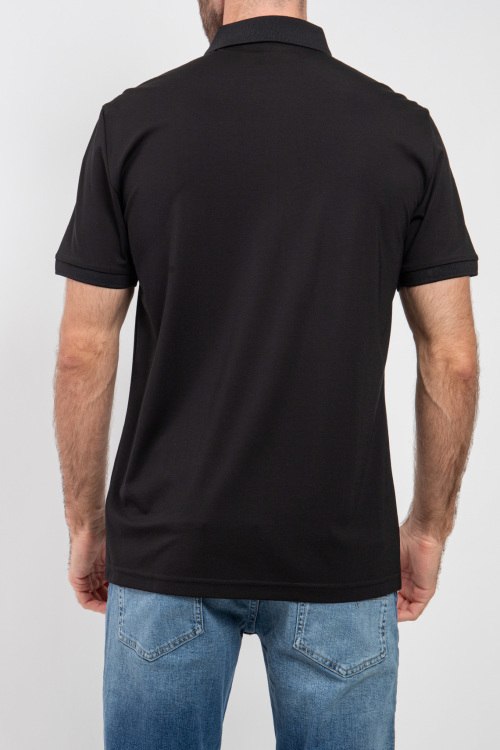 Мужская черная футболка-поло из вискозы от Armani (Армани). Логотип на груди, отложной воротник, застежка-молния, короткий рукав, классическая длина.