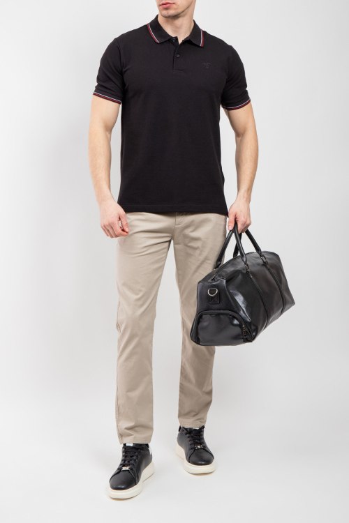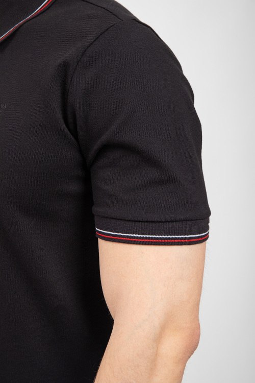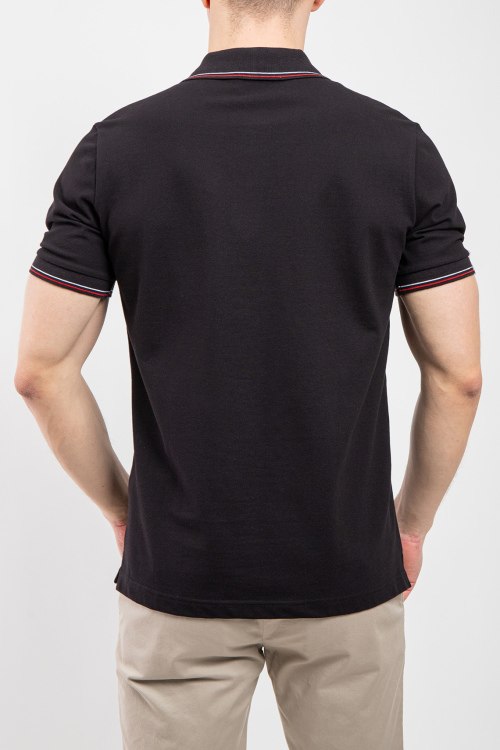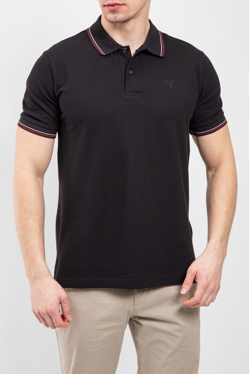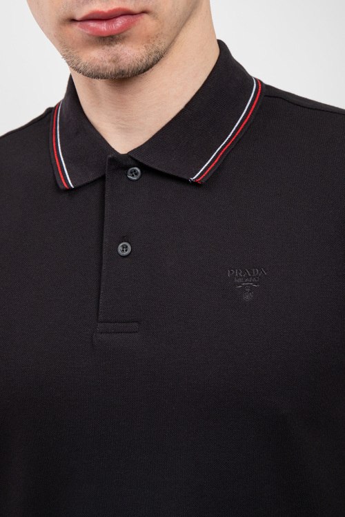 Мужская черная хлопковая футболка-поло от Prada (Прада). Логотип на груди, отложной воротник, застежка на две пуговицы, короткий рукав, контрастная окантовка, классическая длина.