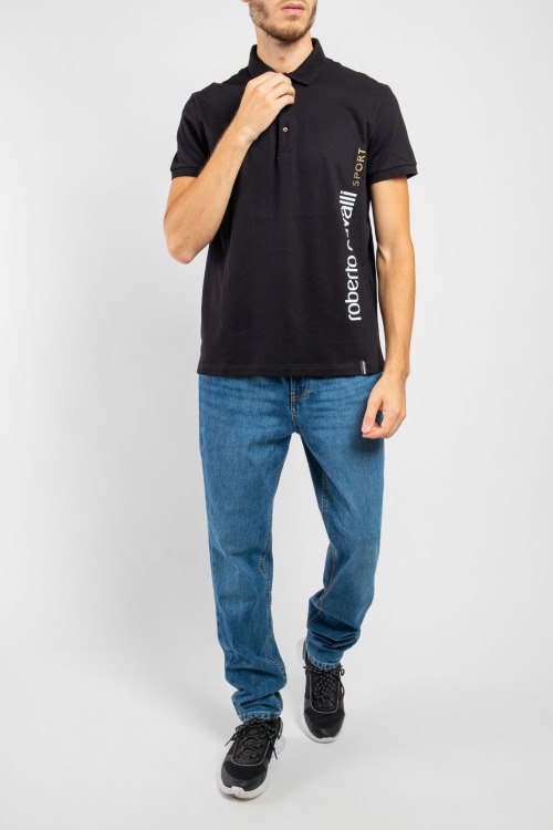 Детали: Мужская черная футболка-поло из хлопка от Roberto Cavalli (Роберто Кавалли). Классическая длина, короткие рукава, отложной воротник, три пуговицы, дизайн с принтом