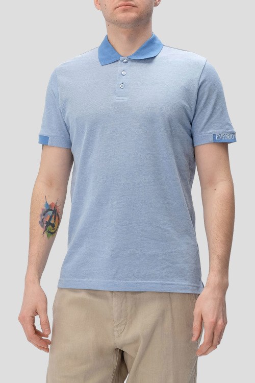 Детали: Мужская голубая хлопковая футболка-поло от Emporio Armani (Эмпорио Армани). Отложной воротник, застежка на три пуговицы, короткий рукав с логотипом, классическая длина