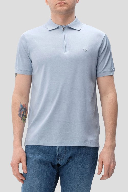Детали: Мужская голубая футболка-поло из лиоцелла и хлопка от Emporio Armani (Эмпорио Армани). Отложной воротник, логотип на груди, застежка-молния, короткий рукав, классическая длина