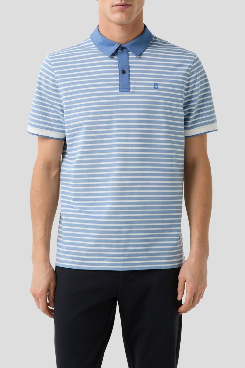 Детали: Мужская голубая хлопковая футболка-поло Timo от Bogner (Богнер). Логотип на груди, принт в полоску, отложной воротник, застежка на две пуговицы, короткий рукав, классическая длина