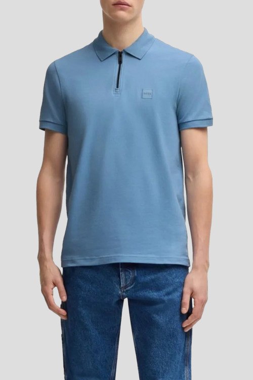 Детали: Мужская голубая футболка-поло Passerzip из хлопка от Hugo Boss (Хуго Босс). Классический воротник, горловина на молнии, короткие рукава, патч-лого на груди