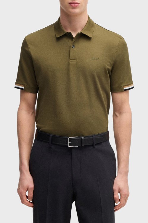 Детали: Мужская хлопковая футболка-поло цвета хаки Parlay от Hugo Boss (Хуго Босс). Логотип на груди, отложной воротник, застежка на две пуговицы, короткий рукав, классическая длина