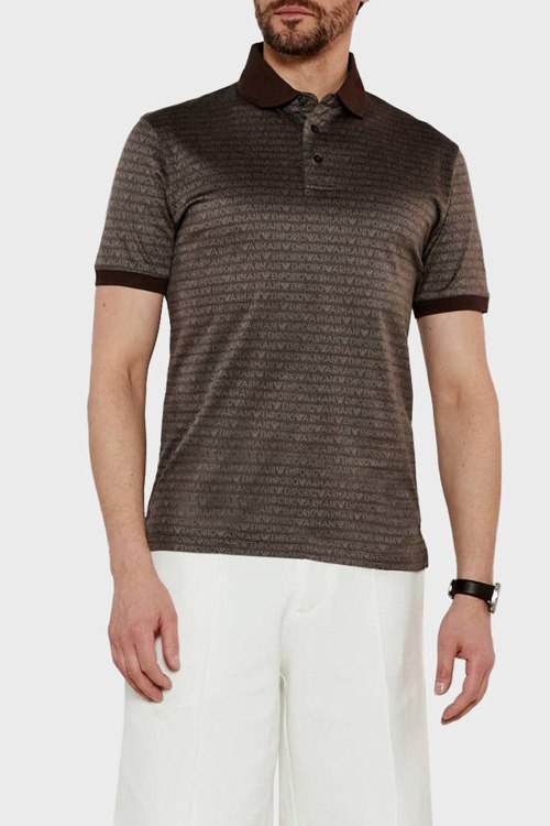 Детали: Мужская коричневая футболка-поло из хлопка от Emporio Armani (Эмпорио Армани). Классический воротник, горловина на пуговицах , короткие рукава, дизайн с монограммой по всей поверхности изделия