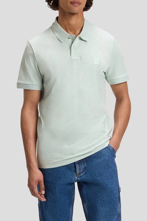 Детали: Мужская мятная хлопковая футболка-поло Passenger от Hugo Boss (Хуго Босс). Логотип на груди, отложной воротник, застежка на две пуговицы, короткий рукав, классическая длина