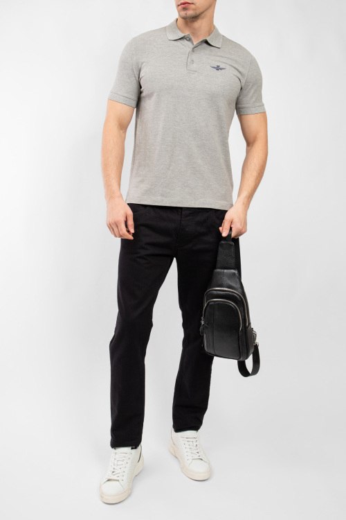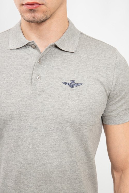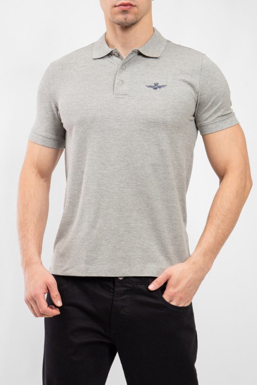 Мужская серая хлопковая футболка-поло от Aeronautica Militare (Аэронавтика Милитари). Вышитый логотип на груди, отложной воротник, застежка на три пуговицы, короткий рукав, классическая длина.