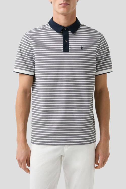 Детали: Мужская серая хлопковая футболка-поло Timo от Bogner (Богнер). Логотип на груди, принт в полоску, отложной воротник, застежка на две пуговицы, короткий рукав, классическая длина