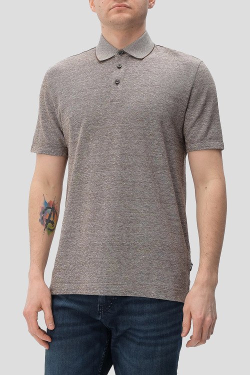 Детали: Мужская серая футболка-поло из хлопка и льна H-Press от Hugo Boss (Хуго Босс). Отложной воротник, застежка на три пуговицы, короткий рукав, классическая длина