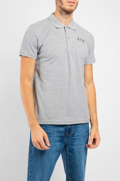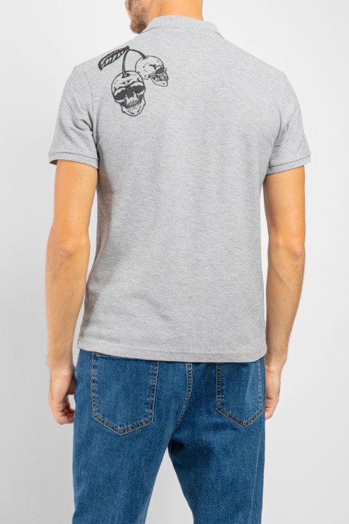 Детали: Мужская серая футболка-поло из хлопка от John Richmond (Джон Ричмонд). Классическая длина, короткие рукава, отложной воротник, две пуговицы, дизайн с принтом