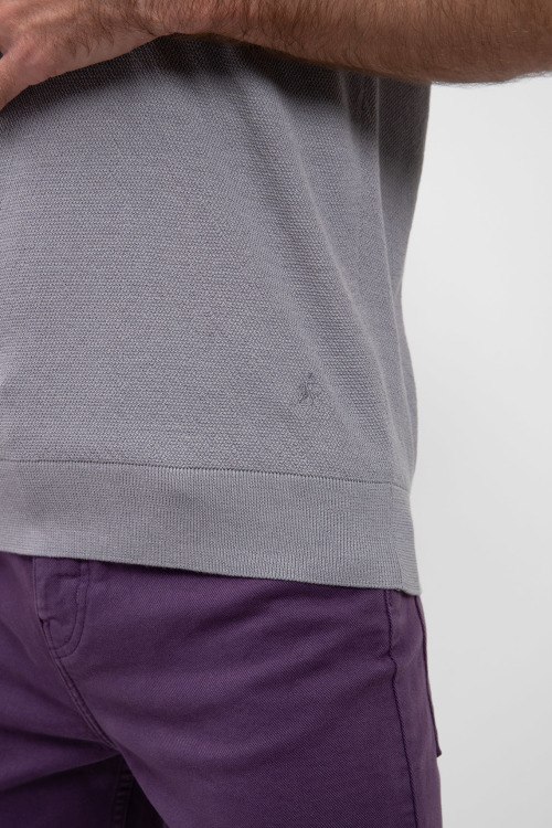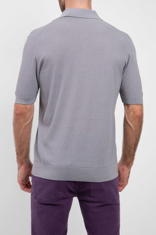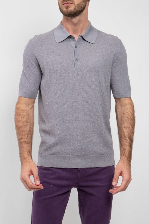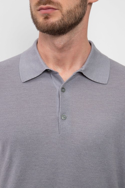 Мужская серая футболка-поло из хлопка и шелка от Scabal (Скабал). Классический воротник, застежка на пуговицы, короткие рукава, трикотажная резинка на манжетах и по низу изделия, вышитый логотип бренда.