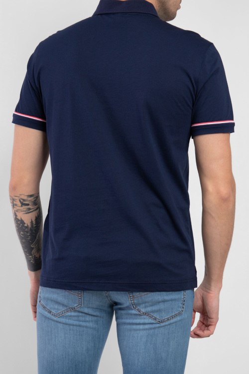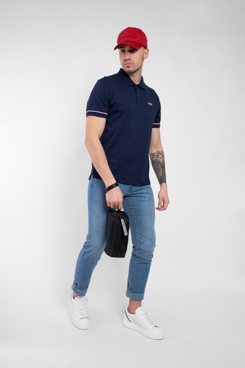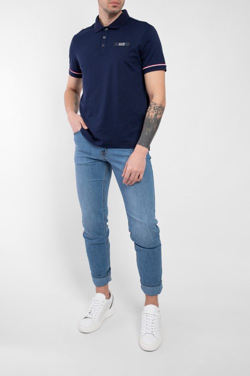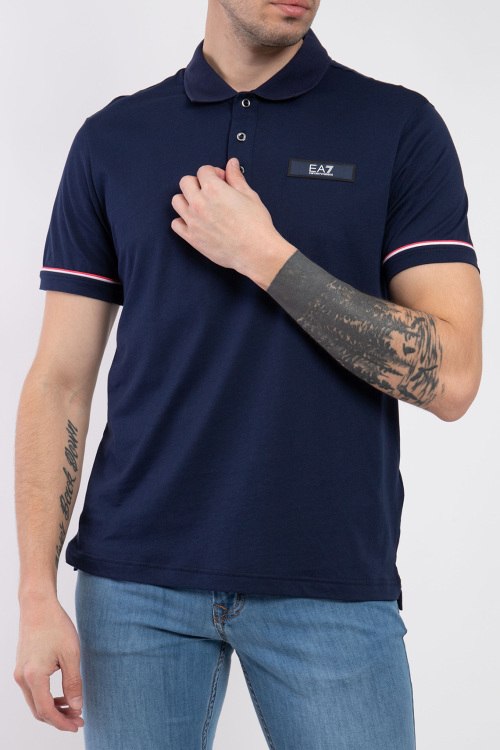 Мужская темно-синяя футболка-поло из хлопка от EA7 Emporio Armani (ЕА7 Эмпорио Армани). Классическая длина, отложной воротник, горловина на пуговицах, короткие рукава, патч-лого, трикотажная резинка на манжетах с контрастной полоской.