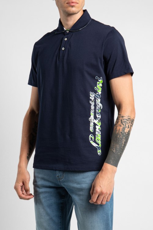 Мужская футболка-поло темно-синего цвета из натурального хлопка от Automobili Lamborghini (Автомобили Ламборгини). Короткие рукава, свободный крой, отложной воротник, застегивается на пуговицы. Декорирована сбоку ярким принтом.