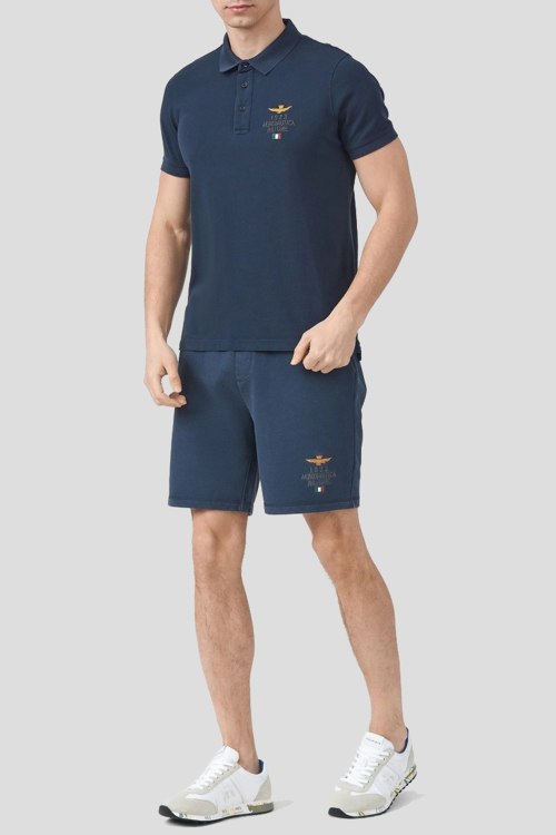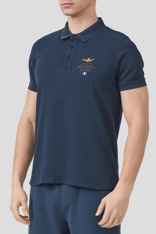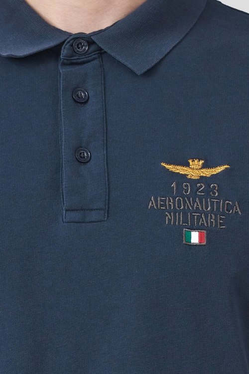 Детали: Мужская темно-синяя хлопковая футболка-поло от Aeronautica Militare (Аэронавтика Милитари). Вышивка на груди, отложной воротник, застежка на три пуговицы, короткий рукав, классическая длина