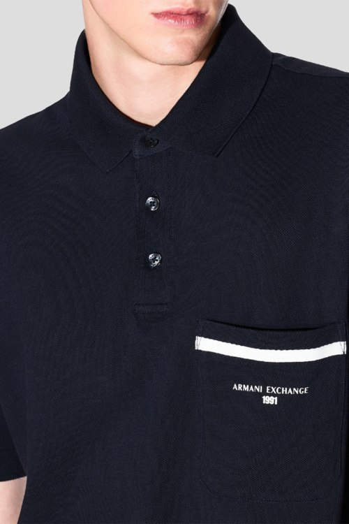 Детали: Мужская темно-синяя хлопковая футболка-поло от Armani Exchange (Армани Эксчендж). Карман с логотипом на груди, отложной воротник, застежка на три пуговицы, короткий рукав, классическая длина