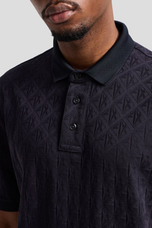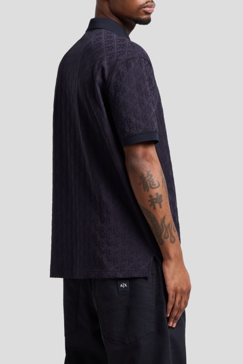 Детали: Мужская темно-синяя хлопковая футболка-поло от Armani Exchange (Армани Эксчендж). Монограмма по всей поверхности, отложной воротник, застежка на три пуговицы, короткий рукав, классическая длина