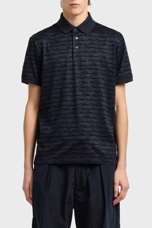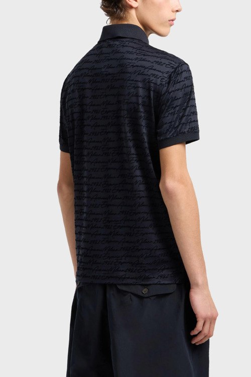 Детали: Мужская темно-синяя футболка-поло из лиоцелла и хлопка от Emporio Armani (Эмпорио Армани). Принт с логотипом по всей поверхности, отложной воротник, застежка на три пуговицы, короткий рукав, классическая длина
