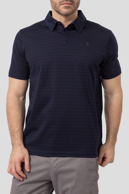 Детали: Мужская темно-синяя хлопковая футболка-поло Duncan от Bogner (Богнер). Принт в полоску, логотип на груди, отложной воротник, застежка на две пуговицы, короткий рукав, классическая длина