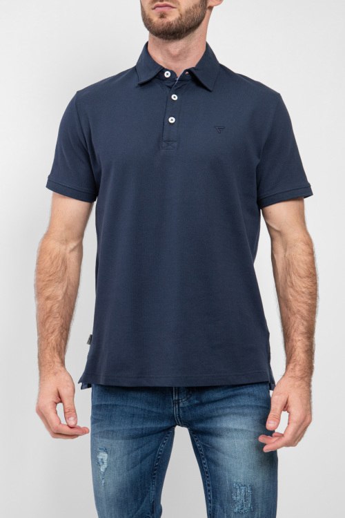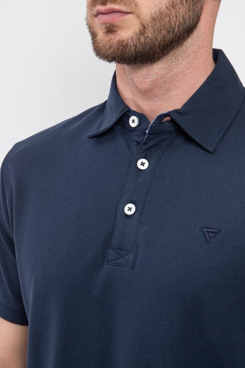 Мужская темно-синяя хлопковая футболка-поло от Fred Mello (Фред Мелло). Логотип на груди, отложной воротник, застежка на пуговицы, короткий рукав, классическая длина.