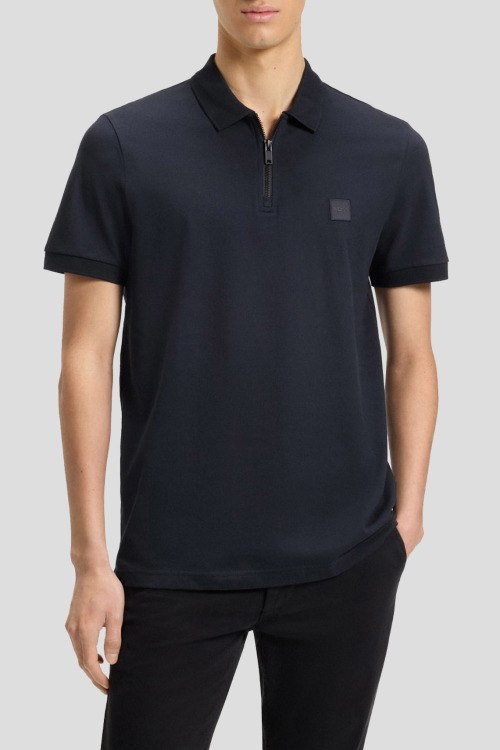 Детали: Мужская темно-синяя хлопковая футболка-поло Passerzip от Hugo Boss (Хуго Босс). Логотип на груди, отложной воротник, застежка-молния, короткий рукав, классическая длина