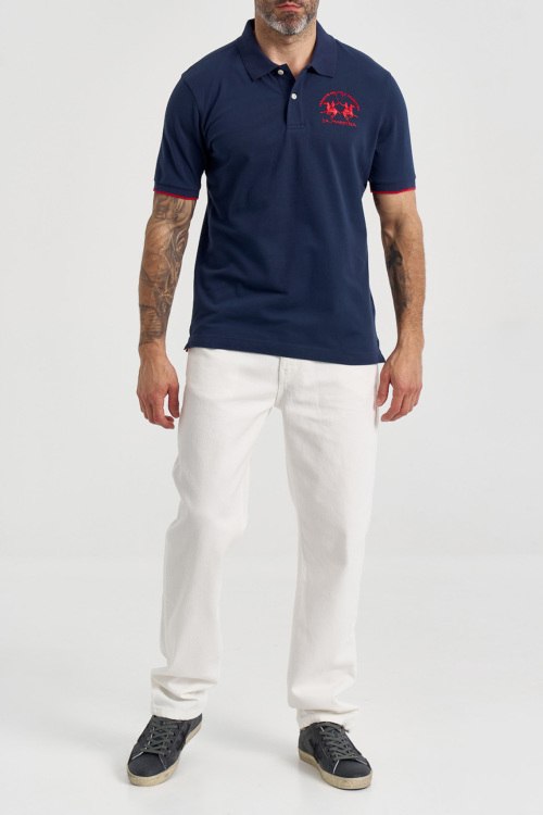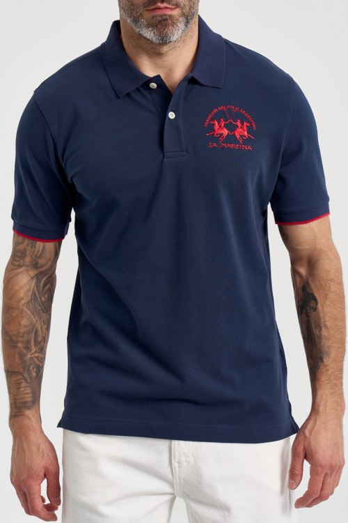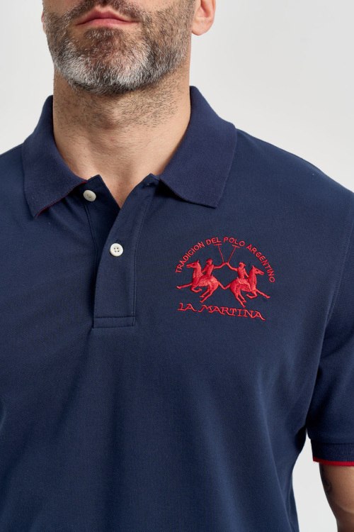 Детали: Мужская темно-синяя хлопковая футболка-поло от La Martina (Ла Мартина). Логотип на груди, отложной воротник, застежка на две пуговицы, короткий рукав, классическая длина. Параметры модели: 103 см - 87 см - 99 см. Рост - 182 см. Размер на фото - L
