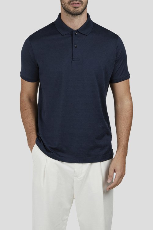 Детали: Мужская темно-синяя футболка-поло из шелка и хлопка от Paul & Shark (Пол энд Шарк). Отложной воротник, застежка на две пуговицы, короткий рукав, классическая длина