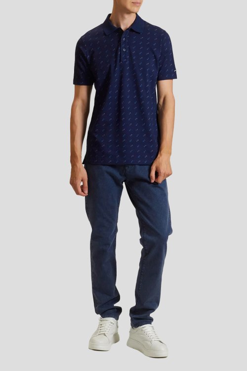 Детали: Мужская темно-синяя хлопковая футболка-поло от Paul & Shark (Пол энд Шарк). Отложной воротник, логотип по всей поверхности, застежка на три пуговицы, короткий рукав, классическая длина