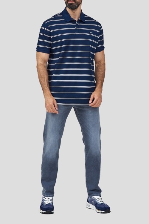 Детали: Мужская темно-синяя хлопковая футболка-поло от Paul & Shark (Пол энд Шарк). Отложной воротник, логотип на груди, принт в полоску, застежка на две пуговицы, короткий рукав, классическая длина