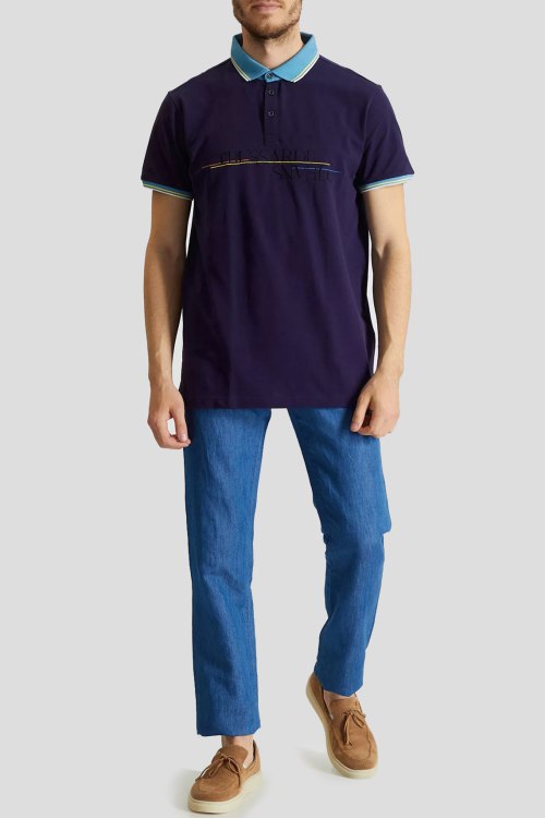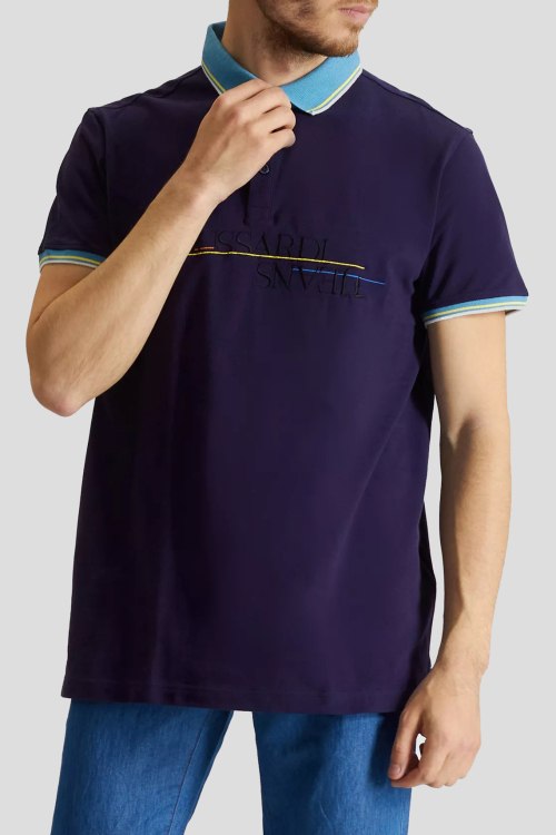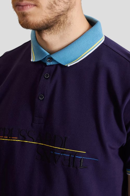 Детали: Мужская темно-синяя хлопковая футболка-поло от Trussardi (Труссарди). Вышитый логотип на груди, отложной воротник, застежка на три пуговицы, короткий рукав, классическая длина